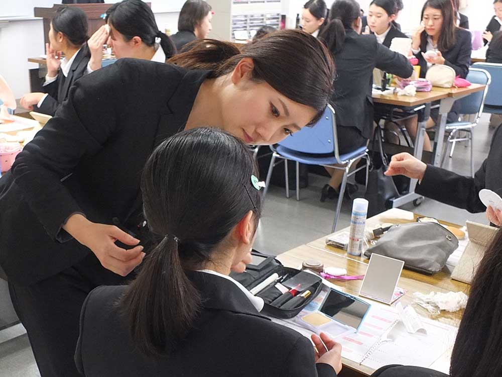 就職の面接時に好印象を持たれるのはとても重要なこと。 そこで毎年、プロのメイクアップ・アーティスト の方々をお招きして、女子学生に向け就職活動用のメイク講座を行っています。 講義だけでなく、自分達で実際にメイクをしていき、要所要所で講師の方々が個別にアドバイスをしてくれるので、 ポイントが押さえやすくなっています。